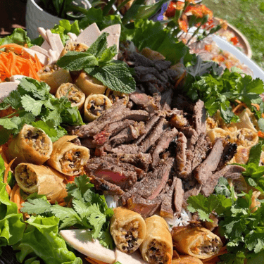Nems au poulet / porc, entrecôte grillé mariné à la citronnelle et gingembre, gio lua (saucisson vietnamien),pousse de soja, carotte, salade, concombre, vermicelle de riz, menthe, coriandre, cacahuète sauce caramel